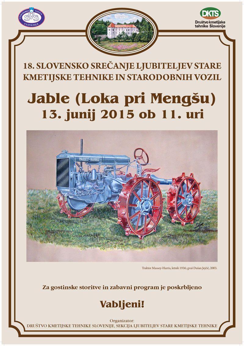 Društvo kmetijske tehnike Slovenije, sekcija ljubiteljev starodobne kmetijske tehnike v sodelavi s Kmetijskim inštitutom Slovenije organizira 13. junija 2015 ob 11. uri v Jablah pri Mengšu 18. slovensko srečanje ljubiteljev starodobne kmetijske tehnike.