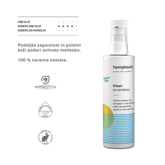Naravna formula eliksirja je obogatena z blagodejno kombinacijo najžlahtnejšega konopljinega olja, olja grozdnih pešk, izvlečka šentjanževke in ognjiča ter svežo aromo limonske trave.