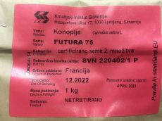 Certificirano seme industrijske konoplje (Cannabis sativa L) sorte FUTURA-75, vpisane v EU sortno listo, ena najbolj popularnih sort konoplje v Sloveniji (zaradi idelanega razmerja CBD/THC in obvladljive višine rastline).