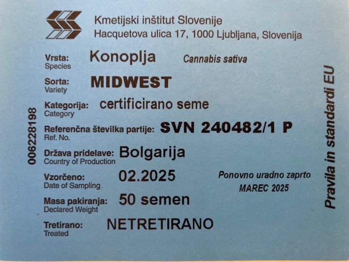 POSEBNA PONUDBA: feminizirana certificirana semena industrijske konoplje (Cannabis sativa L) sorte MIDWEST, vpisane v EU sortno listo. Cena je za paket, pakirano po 50 kos.