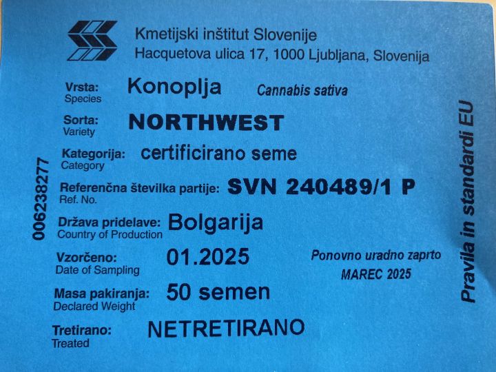 POSEBNA PONUDBA: feminizirana certificirana semena industrijske konoplje (Cannabis sativa L) sorte NORTHWEST, vpisane v EU sortno listo. Cena je za paket, pakirano po 50 kos.