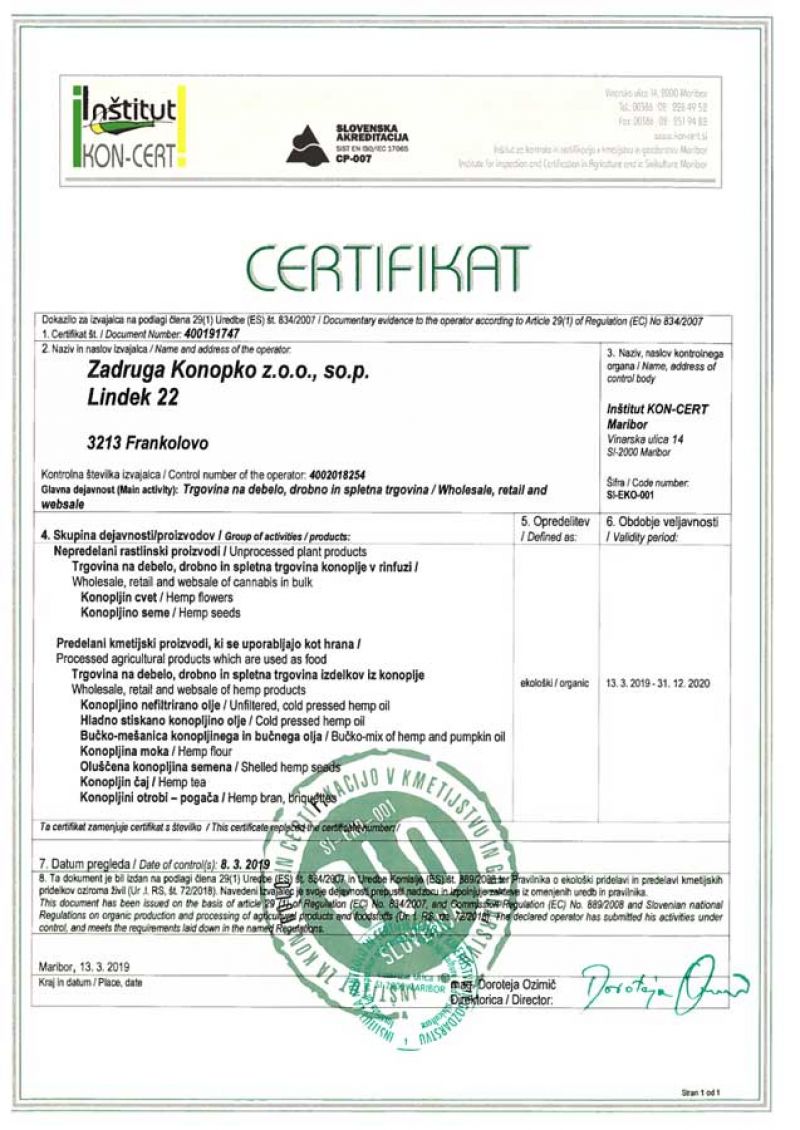 Da so izdelki res vrhunske kvalitete dokazujejo zvesti kupci in pridobljeni certifikati oz. potrdila: BIO Slovenija, Kupujem odgovorno, Kupujem Slovensko. Zadnji v vrsti uspešno pridobljenih certifikatov je ekološki certifikat (SI-EKO-001), s katerim dokazujemo, da so naši prehranski izdelki iz konoplje najvišje kakovosti in vredni zaupanja kupcev. S tem potrjujemo, da naše poslanstvo jemljemo resno in odgovorno do narave in potrošnikov.