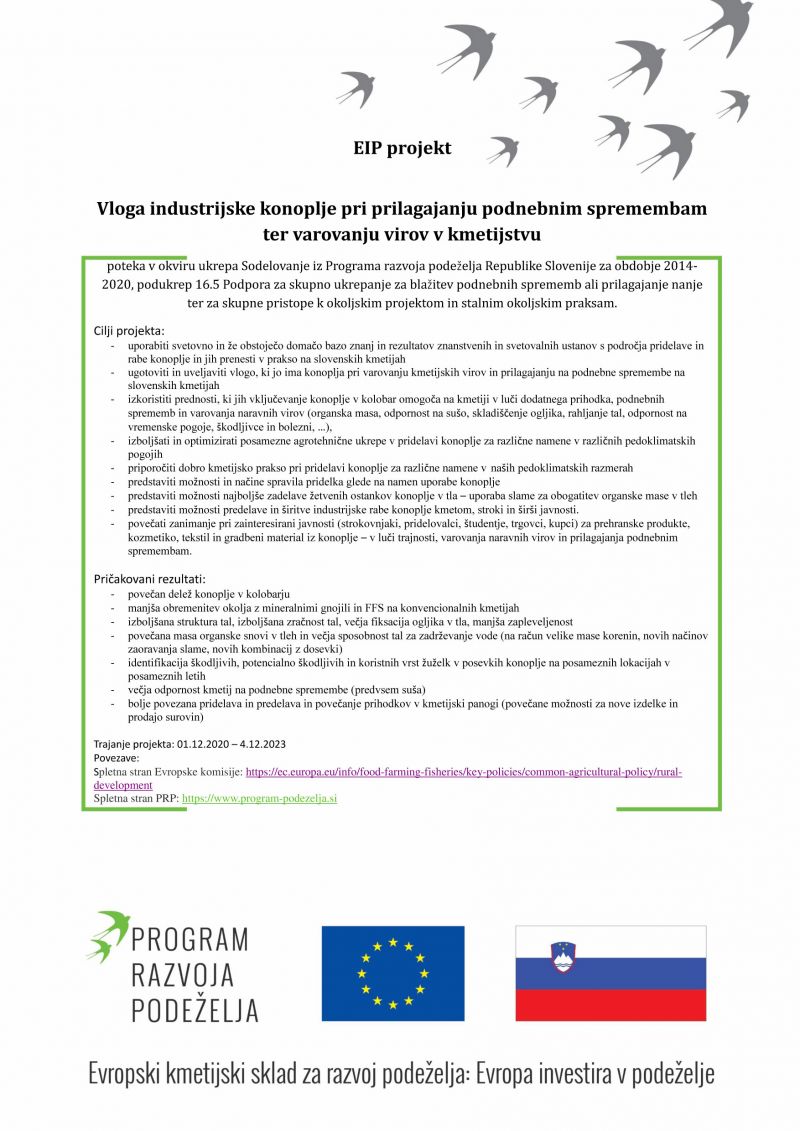 Konec leta 2020 smo s konzorcijem več partnerjev pridobili pozitivno odločbo Agencije za kmetijske trge za sofinanciranje EIP projekta Vloga industrijske konoplje pri prilagajanju podnebnim spremembam ter varovanju virov v kmetijstvu. Projekt poteka v okviru ukrepa Sodelovanje iz Programa razvoja podeželja Republike Slovenije za obdobje 2014-2020, podukrep 16.5 Podpora za skupno ukrepanje za blažitev podnebnih sprememb ali prilagajanje nanje ter za skupne pristope k okoljskim projektom in stalnim okoljskim praksam.